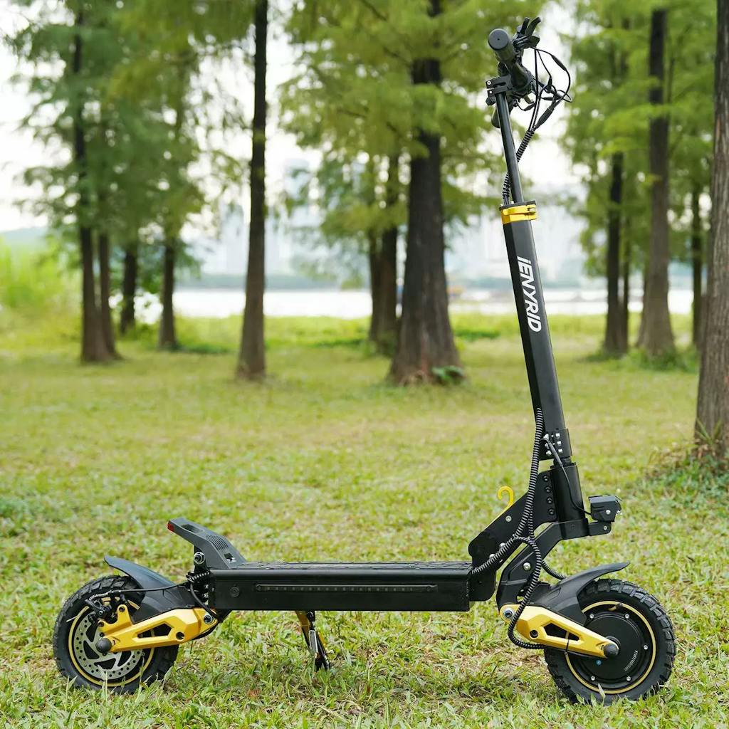 iENYRID ES1 är utrustad med ett avancerat bromssystem som inkluderar mekaniska skivbromsar fram och bak, kompletterat med en elektronisk broms (E-ABS). Detta ger snabb och kontrollerad inbromsning även i höga hastigheter. Med 10-tums pneumatiska off-road-däck och hydraulisk fjädring fram och bak får du en stabil och bekväm körning, oavsett om vägen är ojämn eller full av hinder.